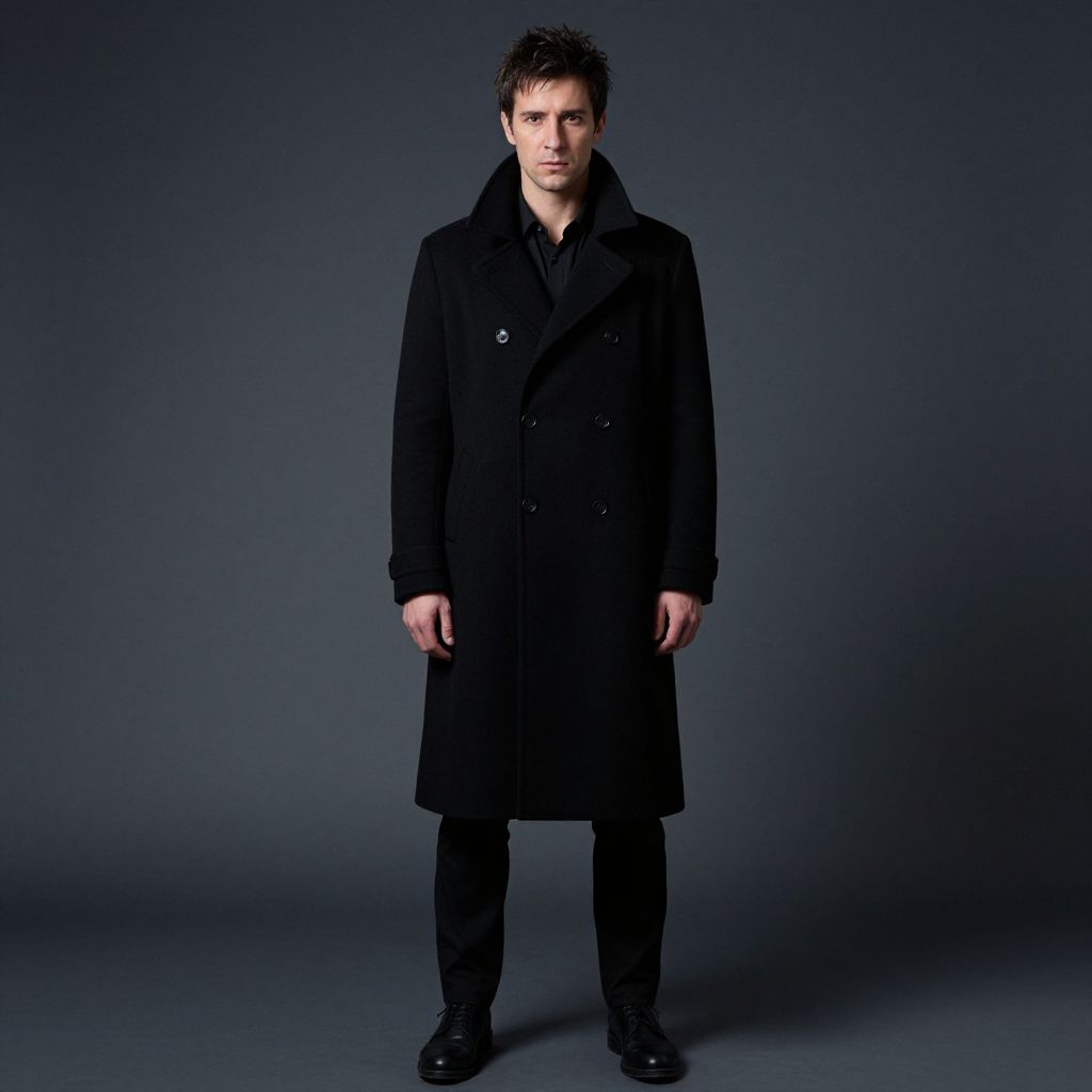 Photograph of a serious-looking man standing against a dark gray background. He's wearing a long, black, double-breasted coat with a high collar, black shirt underneath, black pants, and black shoes. His short, dark hair is slightly messy. He stands with his arms relaxed at his sides, looking directly at the camera. The lighting is even, casting no harsh shadows.