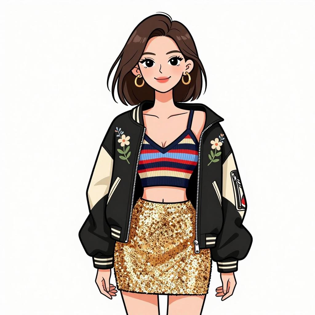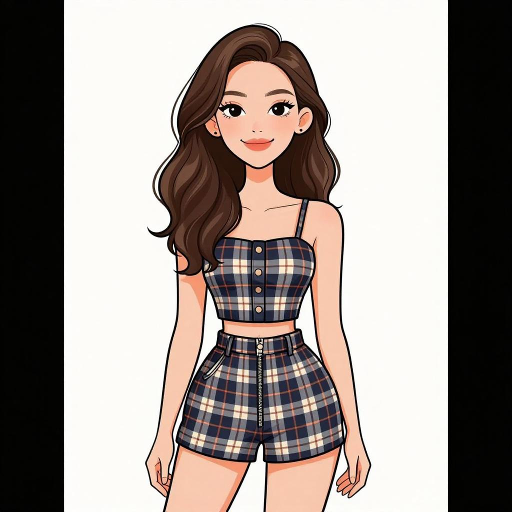 Digital illustration of a smiling woman with long brown hair, wearing a green plaid blazer, white crop top, black shorts, lace-trimmed