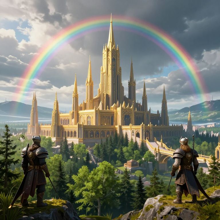 A stunning panoramic view of Asgard, featuring majestic golden halls and intricate Norse architecture, vibrant green forests surrounding the city, with fierce Viking-like guardians standing watch, illuminated by the ethereal light of the Bifrost rainbow bridge stretching across the heavens, epic fantasy scene.