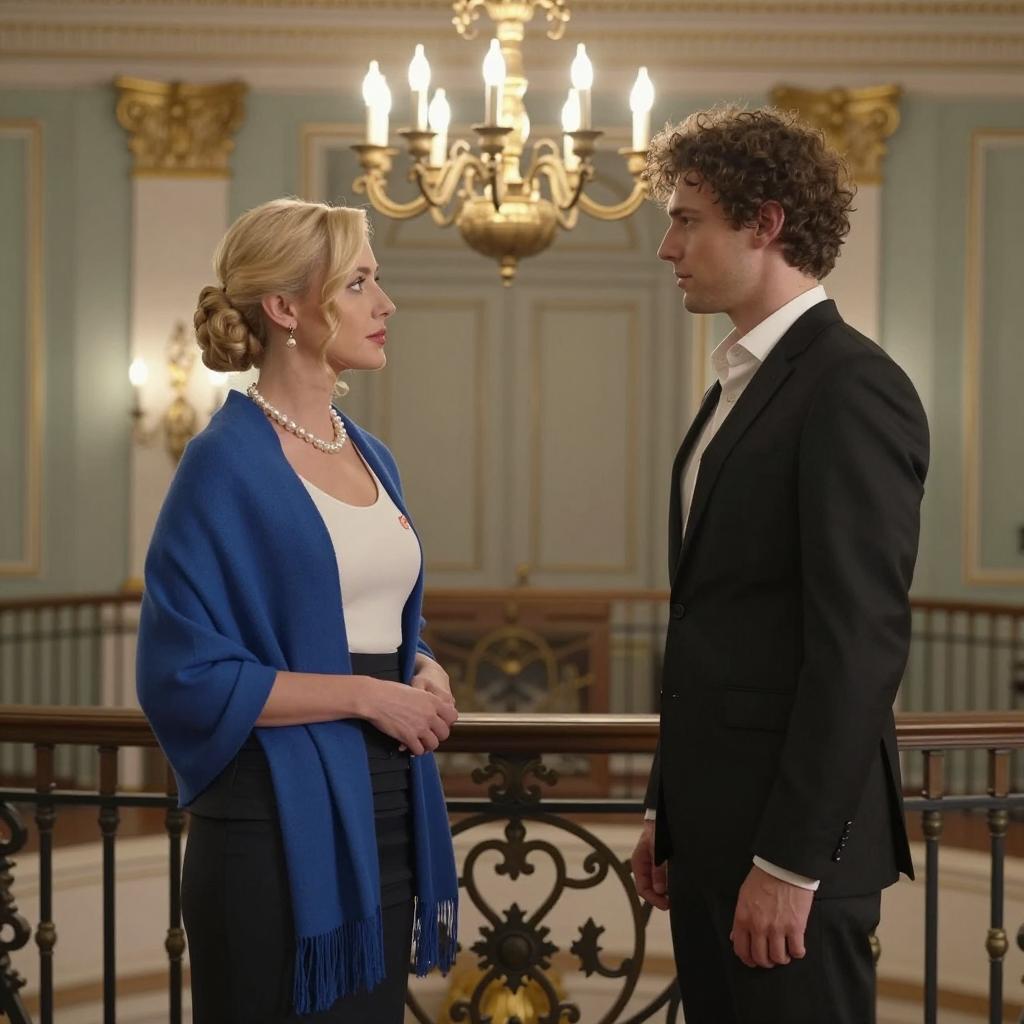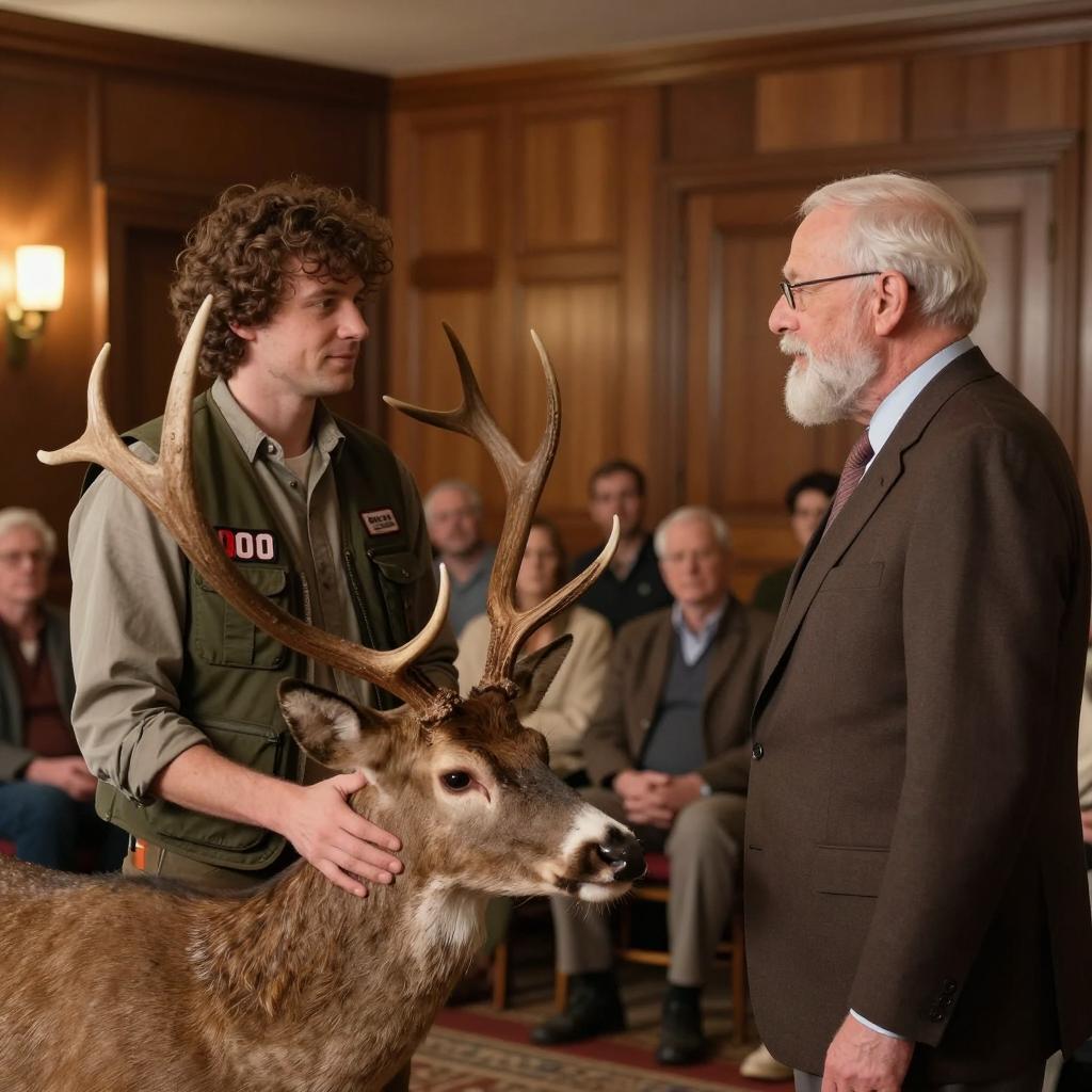 Two men standing in a wood-paneled room. The man on the left has curly brown hair, wears a green vest with a "100" patch, and holds the antlers of a large deer. The man on the right has a white beard, glasses, and wears a brown suit. They stand facing each other, with the deer between them. In the background, a seated audience is blurred. The room has warm lighting and wooden doors.