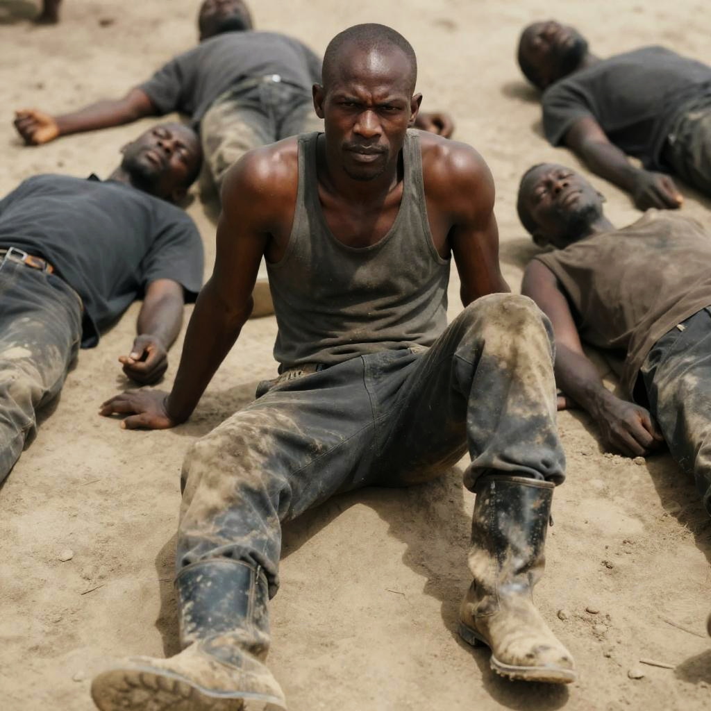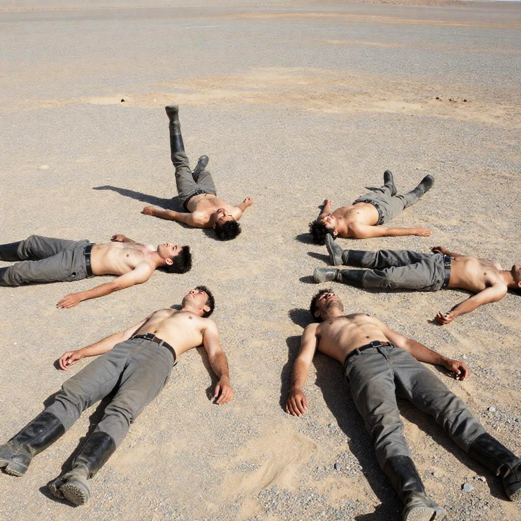 Six shirtless men in gray pants and boots lie on a gravelly desert ground, arms and legs sprawled, some with legs raised. Sunlight casts shadows. Men's faces not visible. Sandy ure covers the ground. Desert setting.