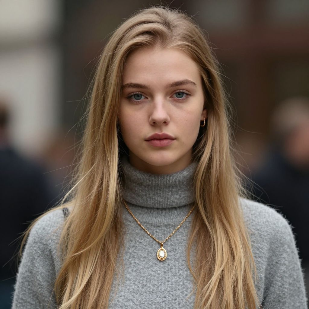 Modern long hairstyle guy, 1girl, solo, blonde hair, jewelry, long hair, realistic, necklace, blue eyes, looking at viewer, lips, blurry background, sweater, turtleneck, blurry, upper body
