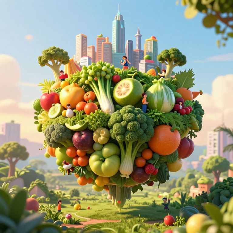 A vibrant 3D-rendered fantasy scene depicts a colossal, floating vegetable orb brimming with colorful fruits, symbolizing a futuristic cityscape where citizens communicate through the aromatic language of fermented produce, set against a serene, high-definition backdrop of lush greenery and soft, golden-hour lighting.
