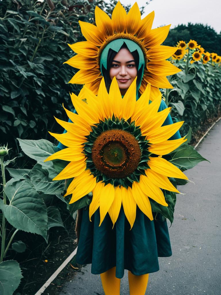 Person with Sunflower Costume, full-body cosplay photo with giant flower headpiece