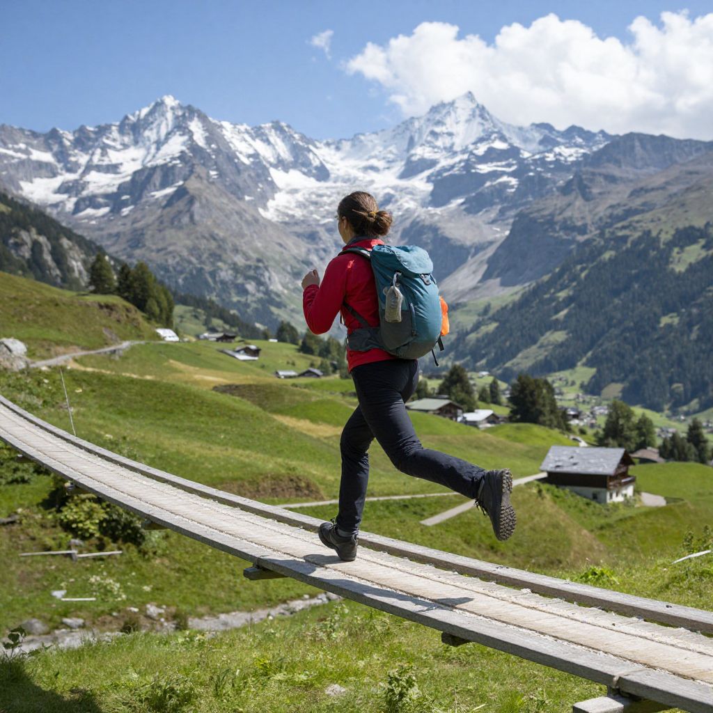 Photograph of a fit woman with brown hair in a ponytail, wearing a white t-shirt, black pants, and black hiking boots, running on a narrow wooden bridge in a mountainous landscape. She carries a black backpack. The background features snow-capped mountains under a clear blue sky, green rolling hills, scattered trees, and a few small red-roofed houses. The bridge has a metal grid surface and is lined with grass and wildflowers. The scene is vibrant and energetic, capturing the adventurous spirit of hiking in a picturesque alpine setting.