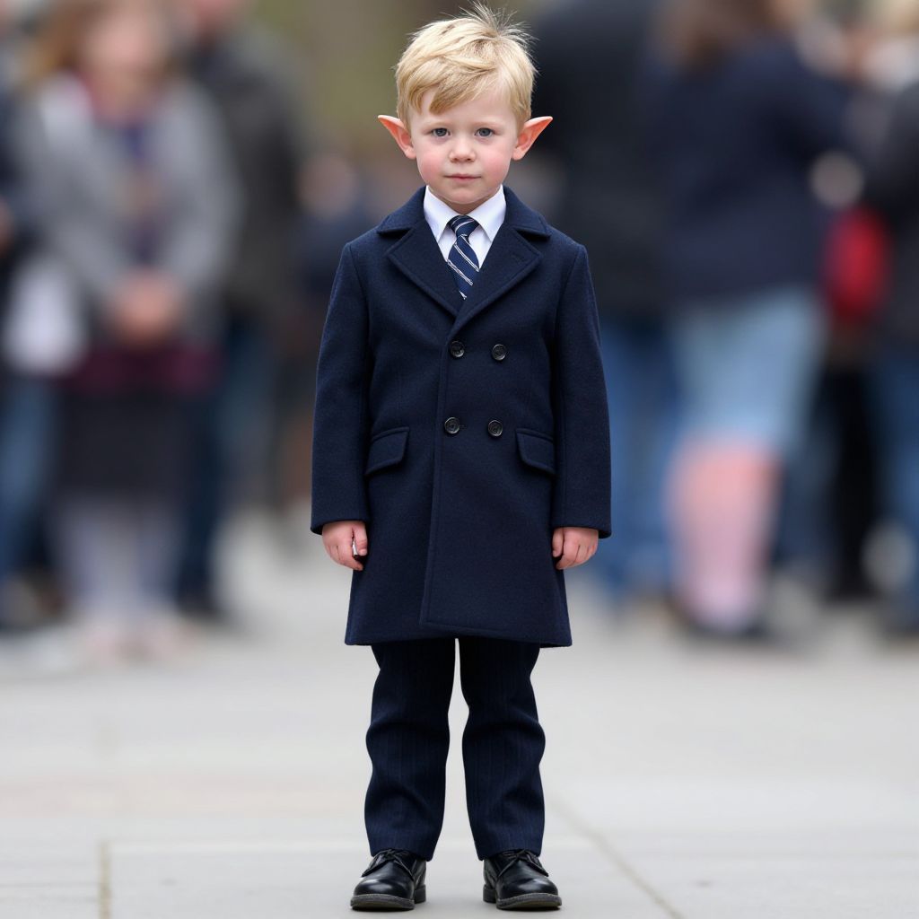 Photograph of a young blonde boy with pointed elf-like ears standing on a white sidewalk. He wears a dark navy blue, double-breasted coat with buttons, a white dress shirt, a black and navy striped tie, and black trousers. His black shoes are polished. The background is blurred, showing a crowd of indistinct, dressed individuals, indicating a public or social event. The boy's expression is neutral, and he stands with his hands by his sides. The image has a shallow depth of field, focusing sharply on the boy while the background remains out of focus.