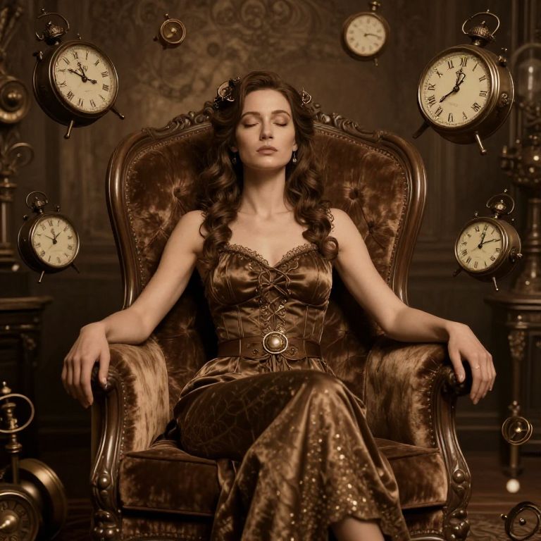 Female hypnotized sitting peacefully in a vintage velvet chair, surrounded by floating clock motifs and swirling patterns, warm sepia tones, steampunk inspired, detailed textures