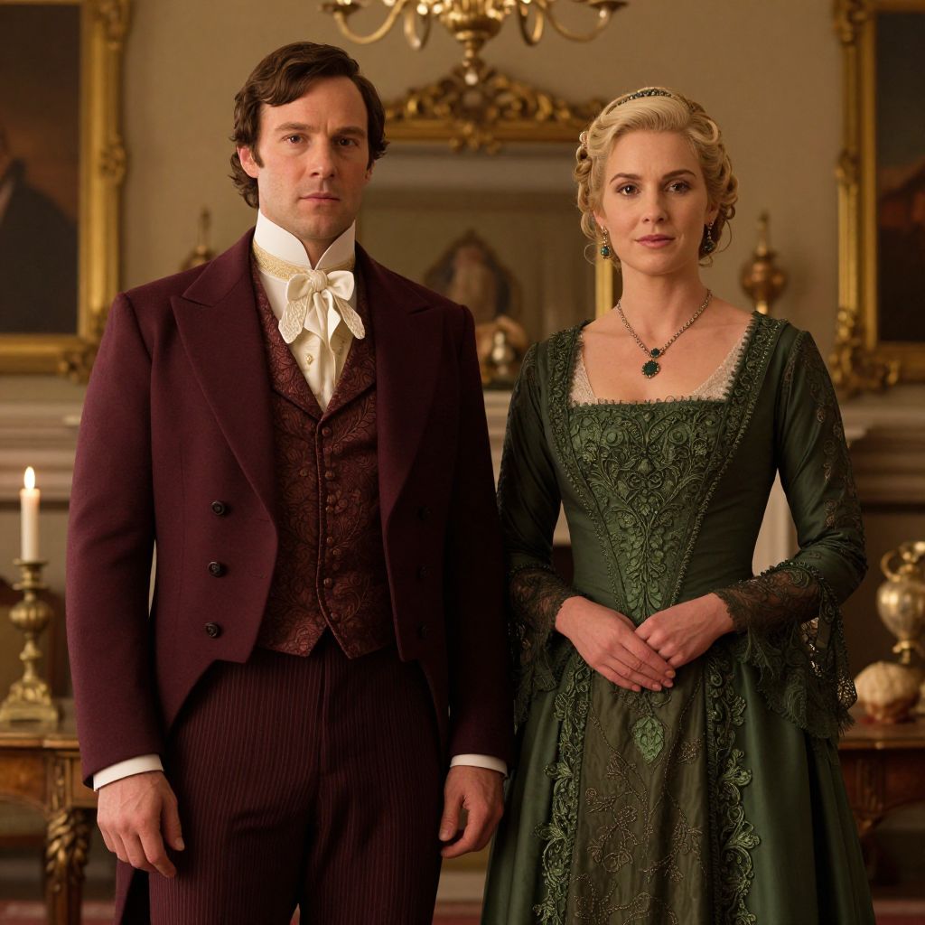 A high-definition digital rendering captures a regal scene reminiscent of \"Downton Abbey,\" featuring a man in a richly detailed maroon suit and a woman adorned in an elegant green gown with intricate lace detailing, set against a backdrop of warm, vintage-inspired lighting and opulent decor.