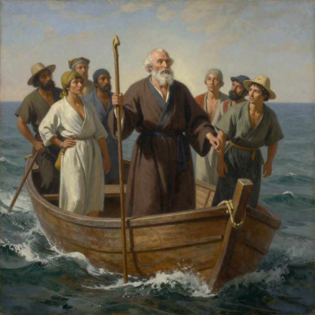 A painting of an elderly man with a white beard and brown robe standing in a wooden boat, holding a staff. He is surrounded by a diverse group of people, including men and women in various clothing styles, on a turbulent sea. The boat is central, with the sea occupying the background.