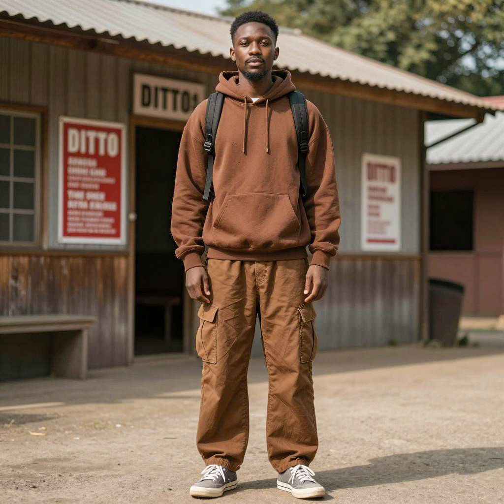 Funny low effort costume, photograph of a black man standing outdoors, daytime, wearing a brown hooded sweatshirt, loose brown cargo pants, gray sneakers, backpack, wooden building with corrugated metal roof in background, "DITTO" sign, red and white posters, trees, sunlit, casual style, realistic, natural light, slightly worn clothes, relaxed posture, soft shadows, background slightly out of focus