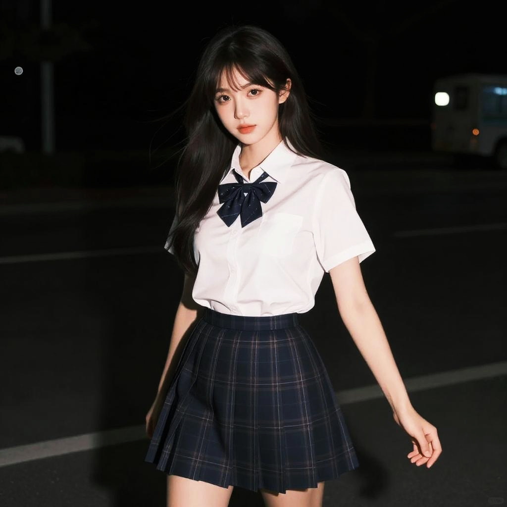 Best quality, masterpiece, ultra high res, (photorealistic:1.4), raw photo, (slender legs)(beautiful hands)(perfect body shape), dynamic pose, 1girl, solo, school uniform, in the dark, deep shadow, low key