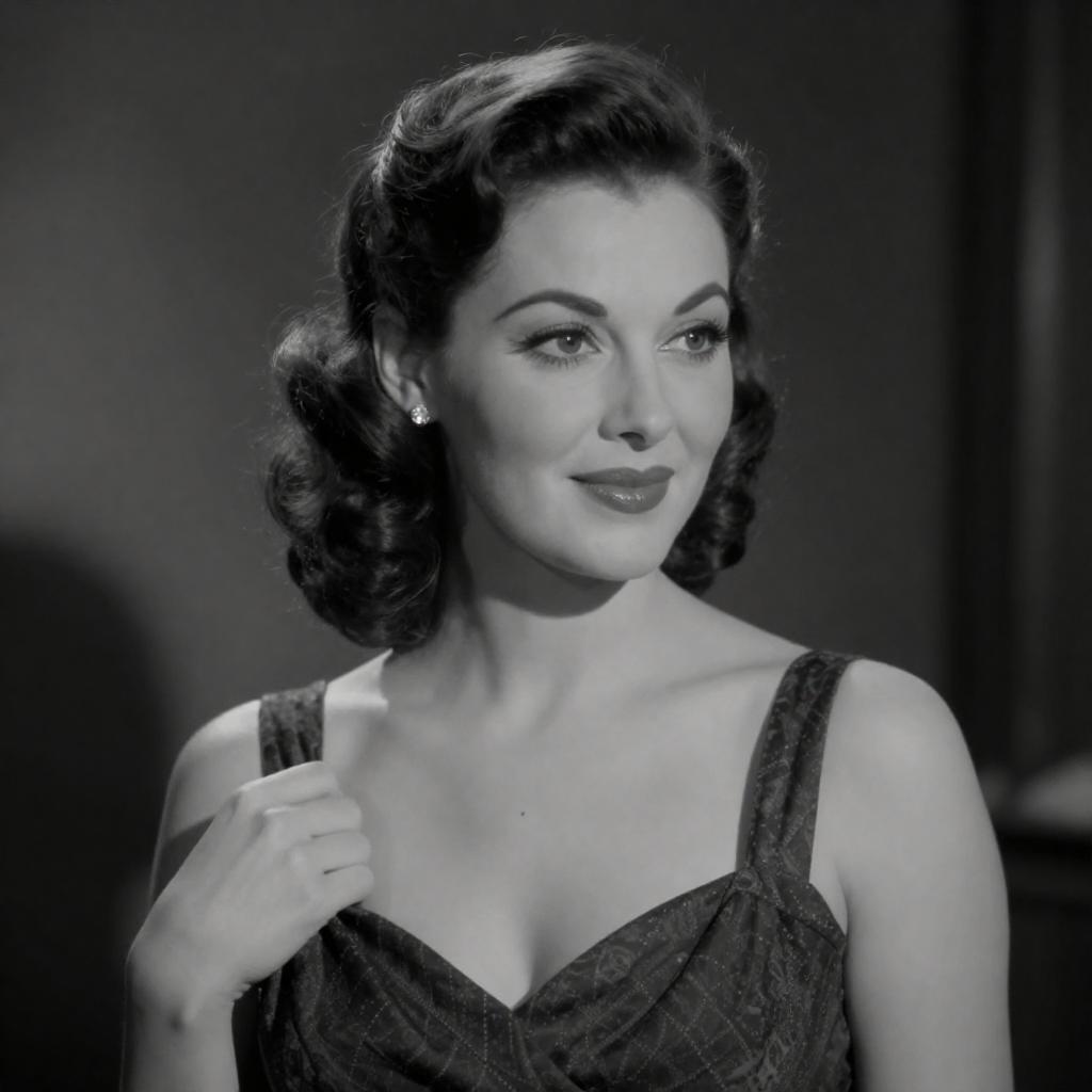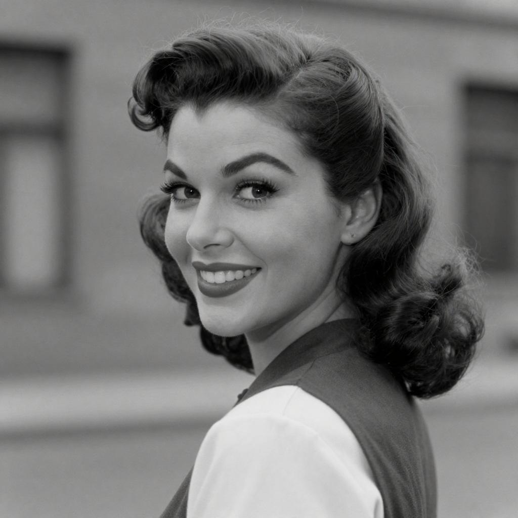 Black-and-white photograph of a smiling woman with wavy hair, wearing a fitted, light-colored jumpsuit with a lace-up front, and white heels. She leans against stacked wooden barrels, one arm raised, exuding a vintage, pin-up style. The barrels create a ured, rustic background.