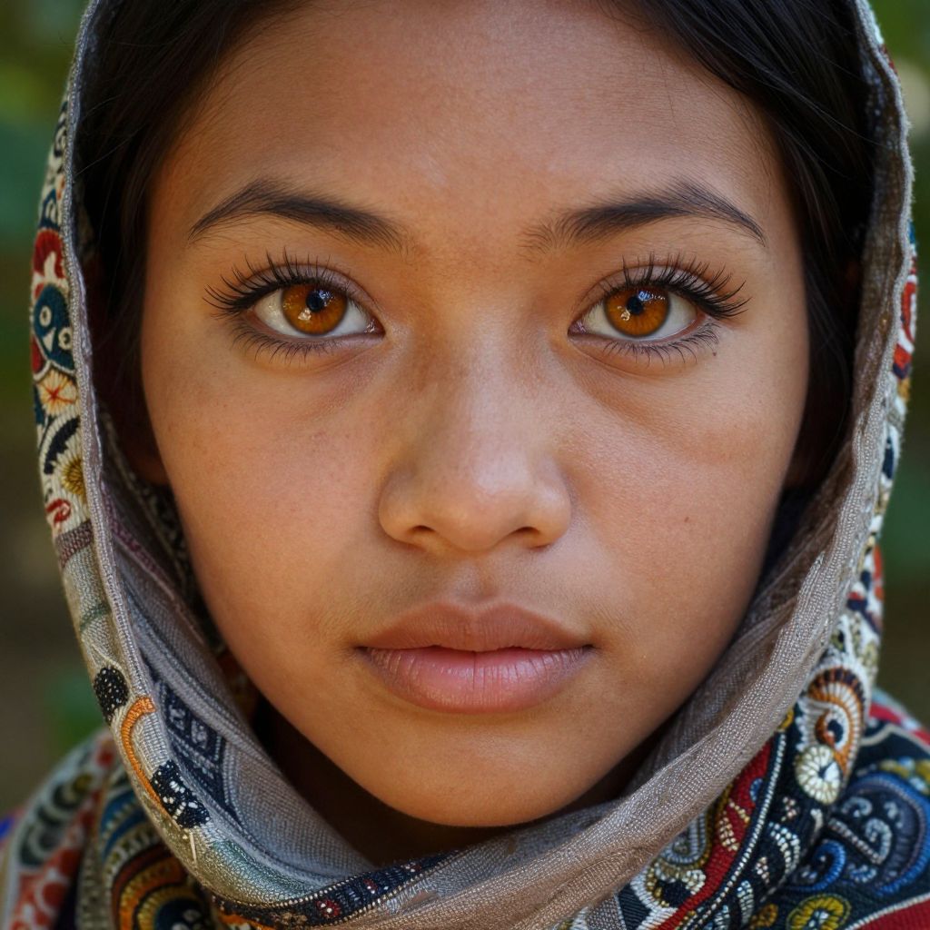 This is a highly detailed, close-up photograph of an Asian girl with large, expressive brown eyes and smooth, light brown skin. She wears a patterned headscarf with intricate designs in red, blue, and white, covering her dark hair. Her eyebrows are dark and slightly arched, and she has long eyelashes. Her lips are full and slightly parted. The background is softly blurred with green hues, suggesting an outdoor setting. The image has a rich, vibrant color palette and a sharp, almost hyper-realistic quality, highlighting the girl's youthful and serene expression.
