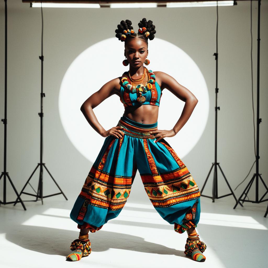 Portrait of a confident female dancer with Bantu knots hairstyle wearing a vibrant, African-inspired ensemble featuring a crop top and wide, patterned pants in orange, teal, and black. She poses in a professional photo studio setting with natural sunlight casting soft shadows, emphasizing her traditional accessories and bold look.