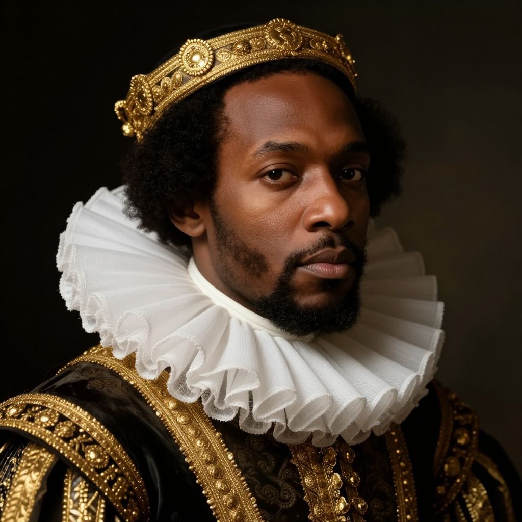 Photograph of a Black man with dark skin and a short, curly beard, wearing an ornate, gold-trimmed crown and a black, intricately embroidered robe. He has a large, white, ruffled collar that contrasts with his dark clothing. His expression is serious, and he gazes slightly to the right. The background is dark, making his attire and face stand out prominently. The image has a classical, baroque style, reminiscent of historical portraits. The lighting is focused on his face, highlighting his features and the textures of his clothing.