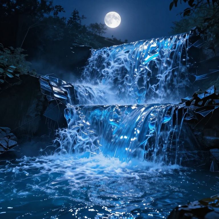 A mesmerizing digital artwork depicts cascading rivers of luminous blue liquid glass flowing uphill, their crystalline surfaces reflecting the radiant moonlight, creating a surreal and ethereal landscape under dramatic nocturnal lighting.