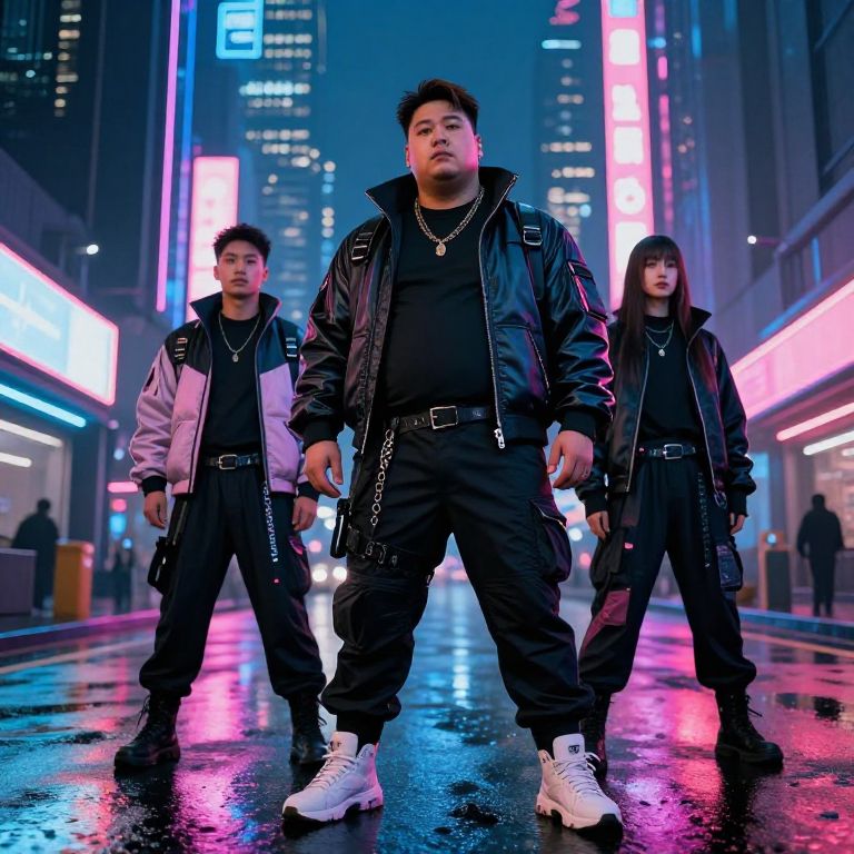Thicc Asians in a futuristic cityscape, neon lights reflecting off rain-soaked streets, fashionable cyberpunk attire, confident poses, intricate technological elements, vibrant color palette with blues and pinks, detailed architecture, dynamic night scene.