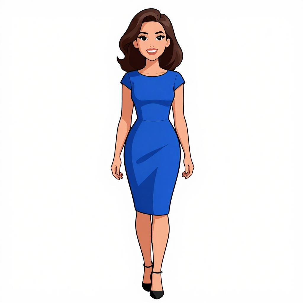 Digital illustration of a smiling woman with medium-length brown hair, wearing a form-fitting blue dress and black heels, standing against a white background.