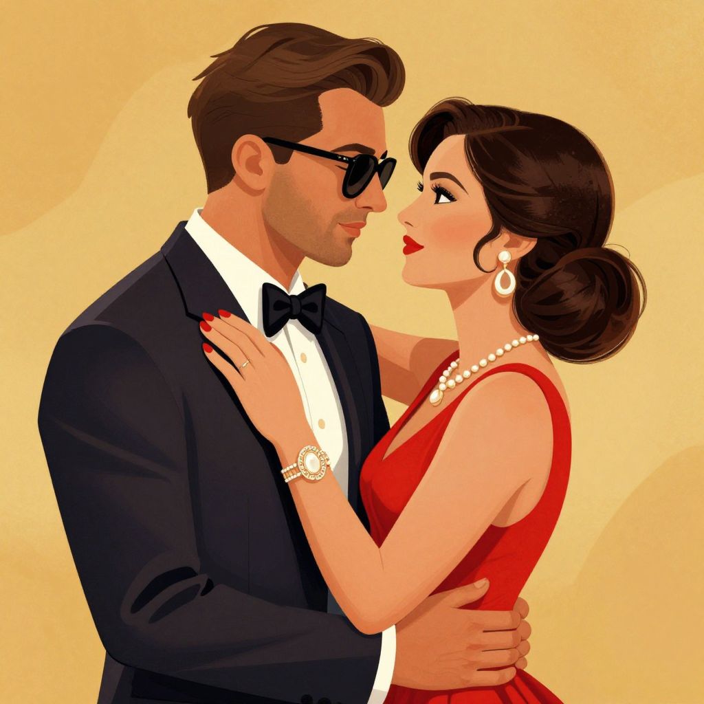 A vibrant digital illustration in a retro-inspired style depicts a couple in a close embrace, with the man wearing a sleek suit and sunglasses, and the woman adorned in a red dress and elegant jewelry, capturing a timeless moment of intimacy and romance against a warm, golden backdrop.
