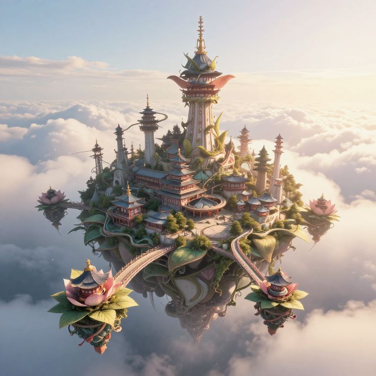 Fantasy CGI illustration of a whimsical, floating palace with ornate, multi-tiered towers, surrounded by clouds and adorned with flower-like structures.