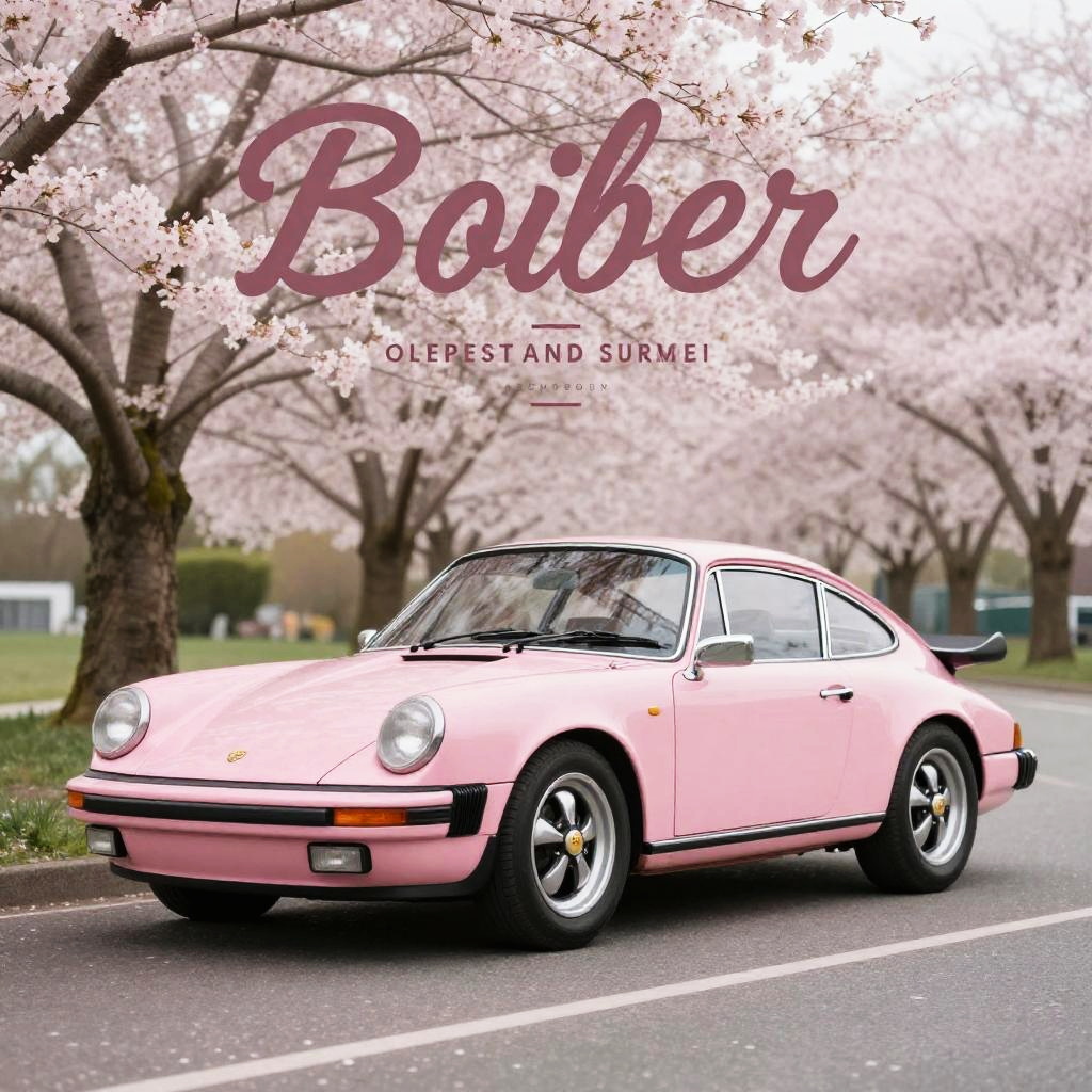 Vintage style poster of a baby pink Porsche 911 parked beside blooming cherry blossom trees, pastel color palette, soft focus and dreamy lighting, elegant typography overlay, nostalgic and artistic representation of classic automotive beauty