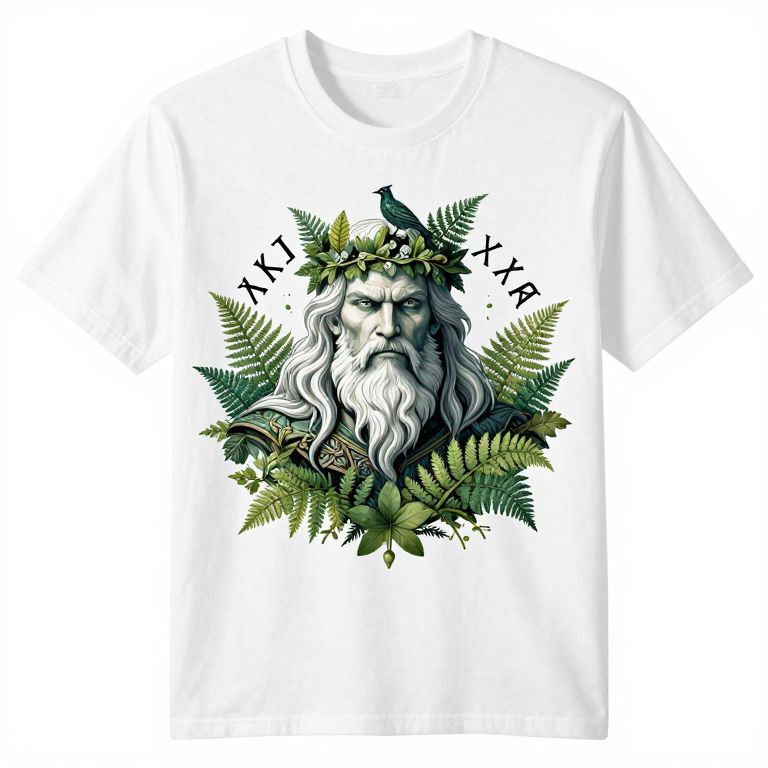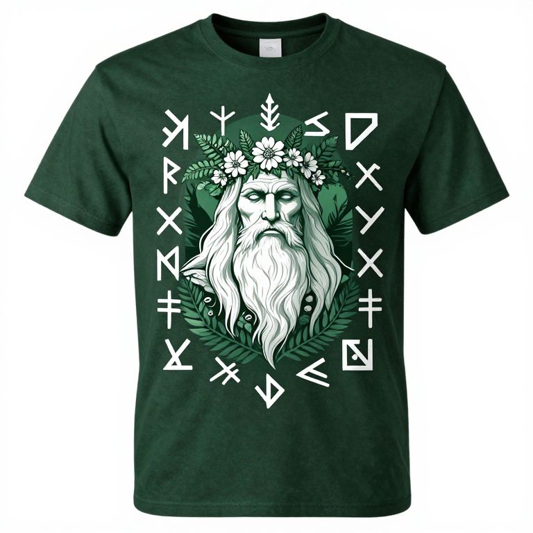 A t-shirt design featuring a Slavic rune motif, depicting a whitewalker-like old king with a fern crown and flower, surrounded by green tones and foliage.