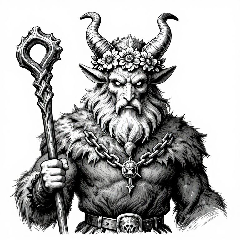 Photograph of a black, short-sleeve T-shirt featuring a digital drawing of a bearded, long-haired figure with a stern expression, adorned with a floral crown. The figure's face is framed by white runes and surrounded by green foliage and white flowers. The T-shirt's background is solid black, emphasizing the white and green elements of the design. The shirt is displayed against a plain white backdrop, highlighting its graphic details. The overall style is modern and mystical.