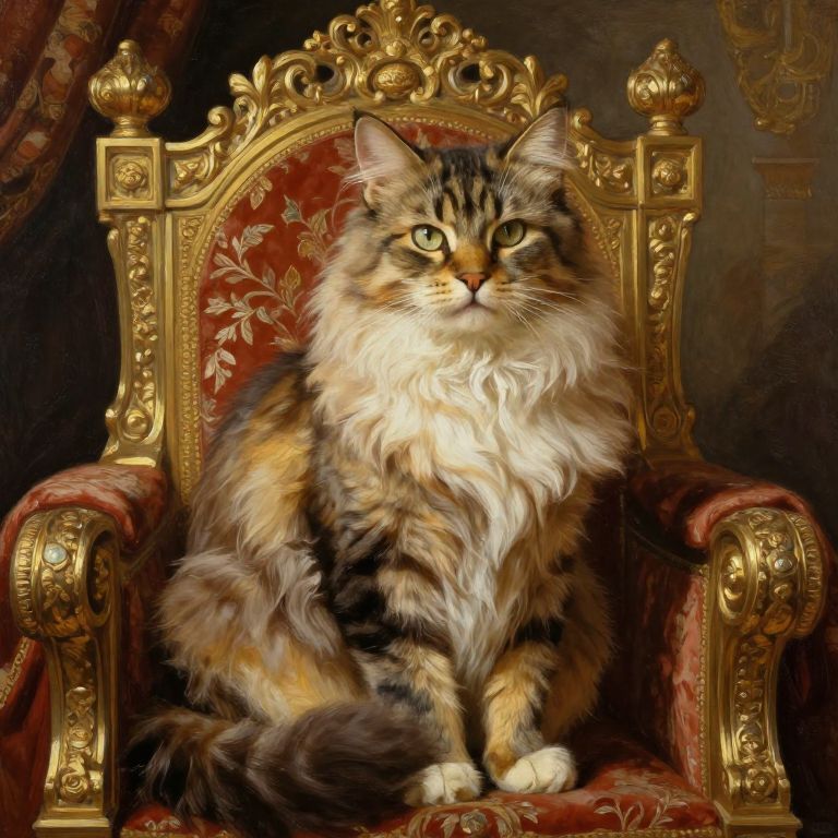 Regal cat painting of a dignified cat with magnificent fur, seated proudly on a throne embellished with intricate carvings, surrounded by luxurious textures and golden accents, reminiscent of classical portrait masterpieces, rendered in rich, warm colors and painterly style.