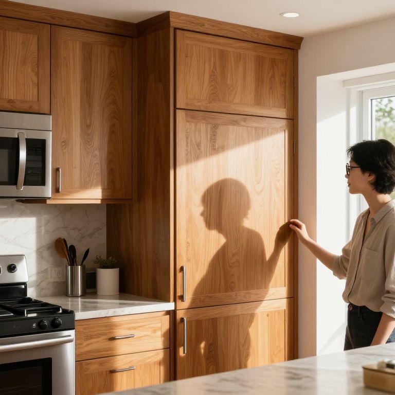 Photograph of a woman in glasses, beige shirt, touching wooden kitchen cabinet, sunlight casting her shadow, modern kitchen with stainless steel stove and marble countertops