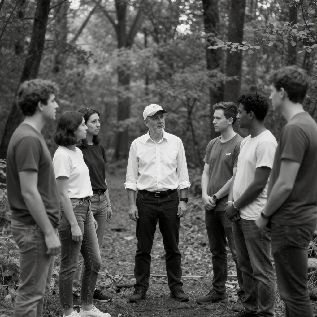 Black-and-white photograph of seven people standing in a forest. A man in a white shirt and cap stands in the center, surrounded by six casually dressed individuals, including two women with short hair and four men in jeans and t-shirts. They are engaged in conversation, with some looking at the man in the white shirt. Trees and foliage fill the background.