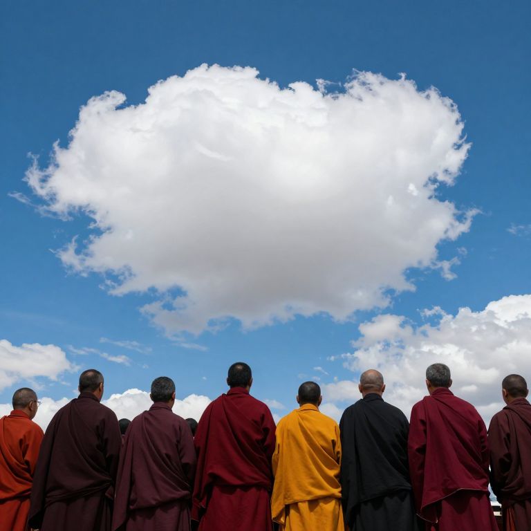People clad in colorful robes stand in a solemn gathering, gazing upward at a massive, billowing cloud formation against a vivid blue sky.