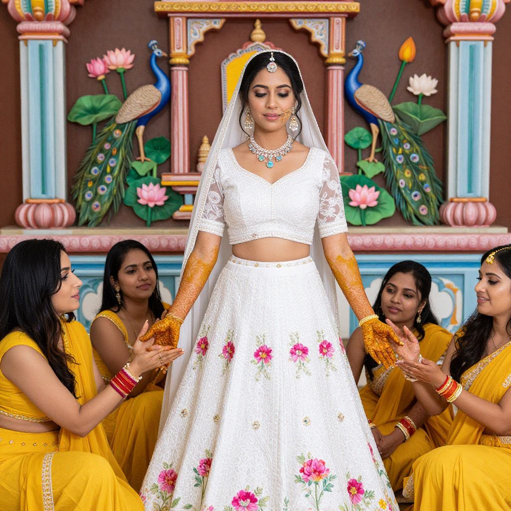 A stylish bride in her late twenties with glowing olive skin and soft, dark eyebrows is dressed in a luxurious white lehenga with floral haldi patterns, standing in front of a brightly painted Indo-South Asian temple with peacocks and lotus flowers in the background, surrounded by women applying haldi paste to her arms and legs during a traditional bridal ceremony.