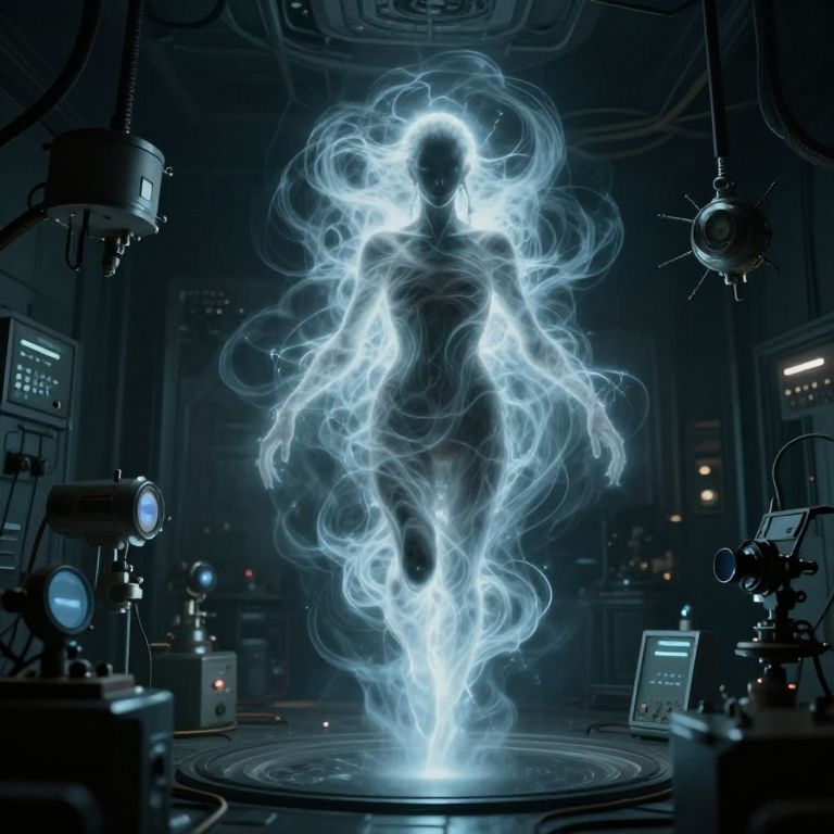 Digital art of a glowing, ethereal humanoid figure with swirling blue energy, standing in a dark, futuristic laboratory surrounded by scientific equipment.