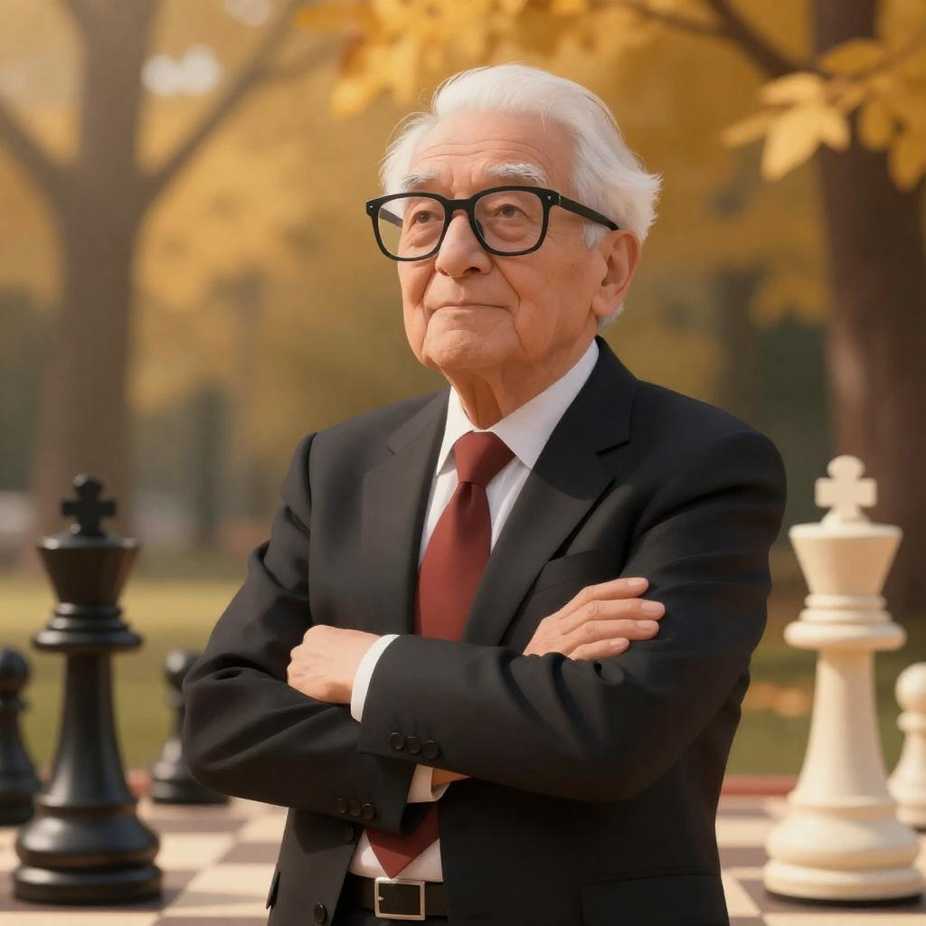 Digital illustration of an elderly man with large glasses, a pointed nose, and white hair, wearing a black suit, red tie, and white shirt. He stands with arms crossed, looking upward. Background features autumnal yellow trees. Foreground includes large chess pieces, with a white king to the right. Man's expression is focused.