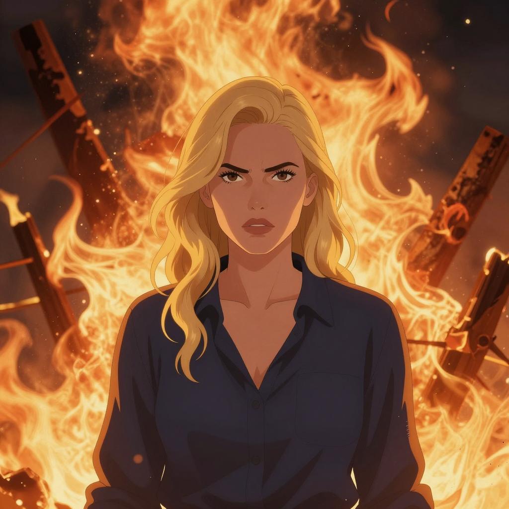 Digital illustration of a frightened blonde woman with wide eyes and red lipstick in the center. Surrounding her are multiple figures: a man with a serious expression in the lower left, a woman screaming in the lower right, a man with a shocked expression in the upper right, a skeletal hand in the lower center, and a figure in dark clothing on the left. Background includes a dark building and a red sky.
