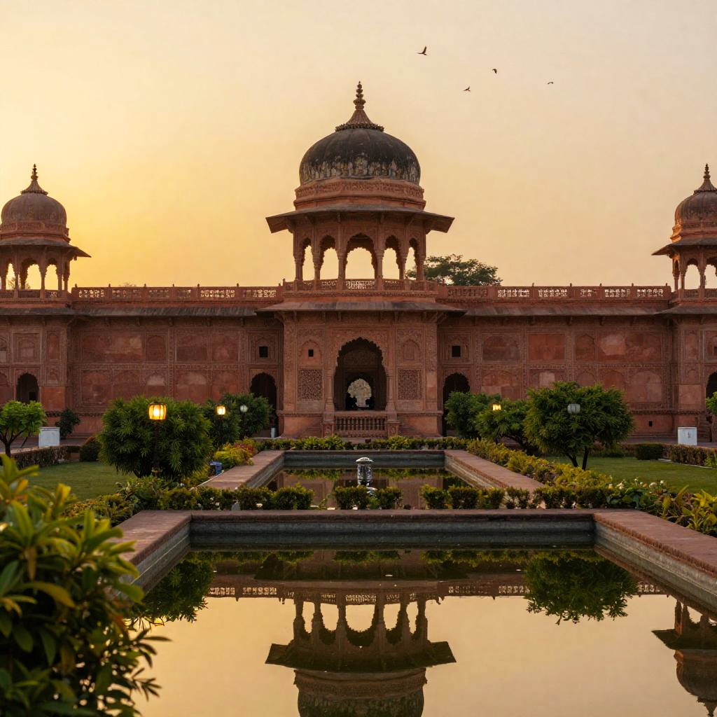Holkar palace at sunset, intricate Rajputana architecture with ornate carvings and lush gardens, reflecting in serene water, warm amber sky, bird flock flying, hyper-realistic style with vibrant colors and soft glowing light effects.
