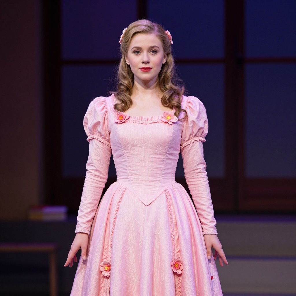 Photograph of a young woman standing on a stage in a brightly lit pink ball gown with puffed sleeves and floral embellishments. She has fair skin, wavy brown hair adorned with a pink flower headband, and red lipstick. The dress features a fitted bodice with lace-up detailing and a full, layered skirt. The background is dark with large, indistinct window panes. The lighting highlights her face and dress, creating a soft, romantic atmosphere. The image captures a sense of elegance and timeless beauty.