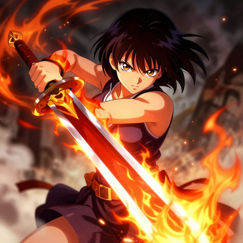 Fire sword anime artwork of a fierce female fighter brandishing a torch-like sword, flames licking the blade, expressive eyes glowing with determination, vibrant fire effects, anime-inspired background with smoke and sparks, sharp lines and vivid colors capturing motion.