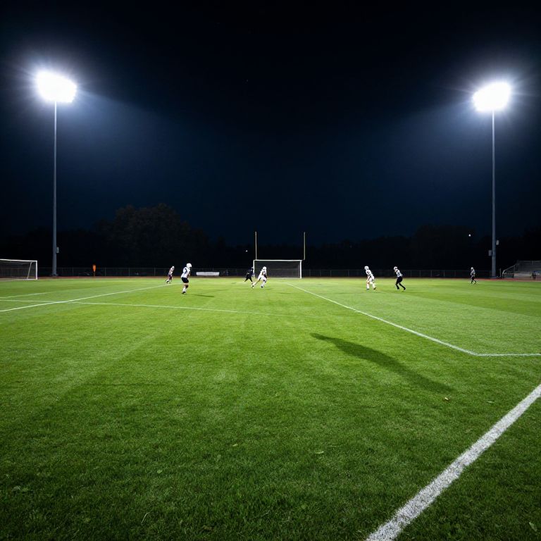 Football field at night under bright stadium lights, with players in action, vibrant green turf, dramatic shadows, and a starry sky background, high detail