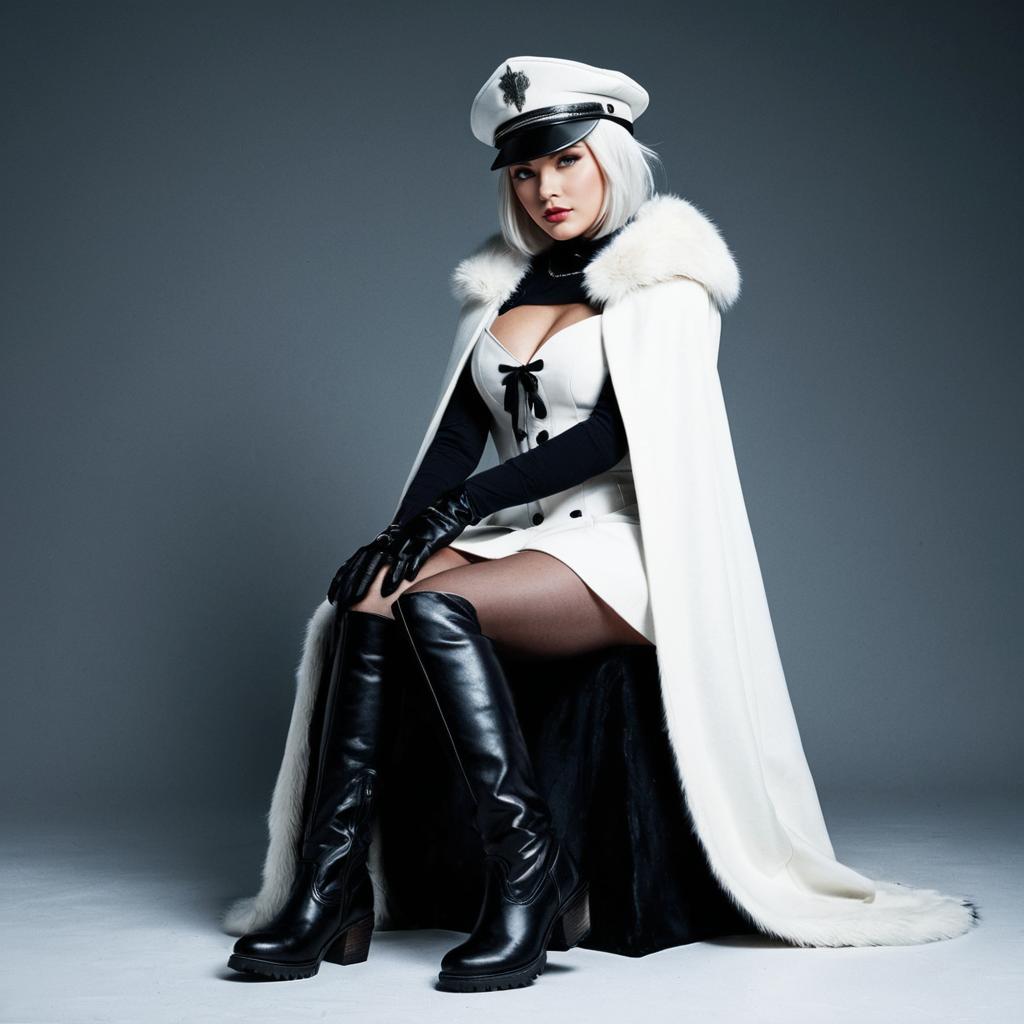 Photograph of a woman in a futuristic, military-inspired outfit. She has pale skin, short platinum blonde hair, and wears a white naval cap with a black emblem. She is dressed in a white, fur-trimmed cape over a black, cleavage-revealing top with a bow, black gloves, and thigh-high black leather boots. She sits with her legs slightly apart on a white surface against a dark gray background. Her expression is serious, with bold red lipstick. The lighting highlights the contrasts between her outfit's white and black elements, creating a dramatic, high-contrast effect.
