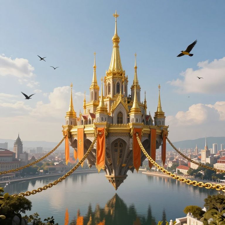 Photograph-style digital illustration of a golden, ornate floating castle with multiple spires, suspended above a calm river by golden chains adorned with orange banners. The castle's intricate architecture features arched windows and detailed carvings. In the background, a cityscape with modern and historical buildings is visible under a clear, blue sky with scattered clouds. Four birds are flying in the sky, adding a dynamic element to the scene. The river reflects the castle and cityscape, enhancing the image's surreal and magical atmosphere.