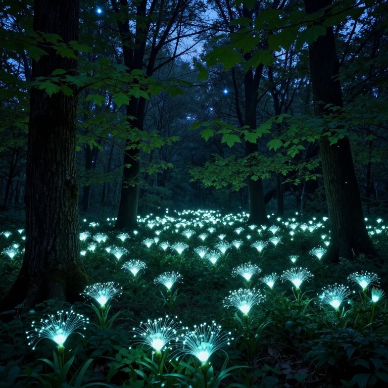 A twilight forest where trees bloom with glowing, fiberoptic flowers and the leaves hum lullabies to wandering stars.