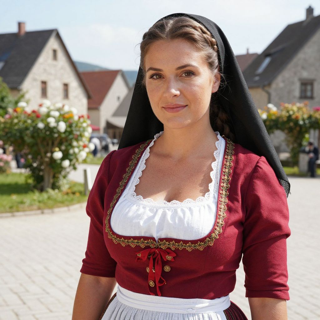A realistic photograph of a woman in a traditional German costume, wearing a bright red burgundy dress with lace trim, a white linen apron, and a flowing black headscarf with braided hair, standing in a sunny rural German village square with stone houses and flowering hedges in the background, her face has warm, gentle features with soft brown eyes and a serene expression.. The woman has big tits and cute face