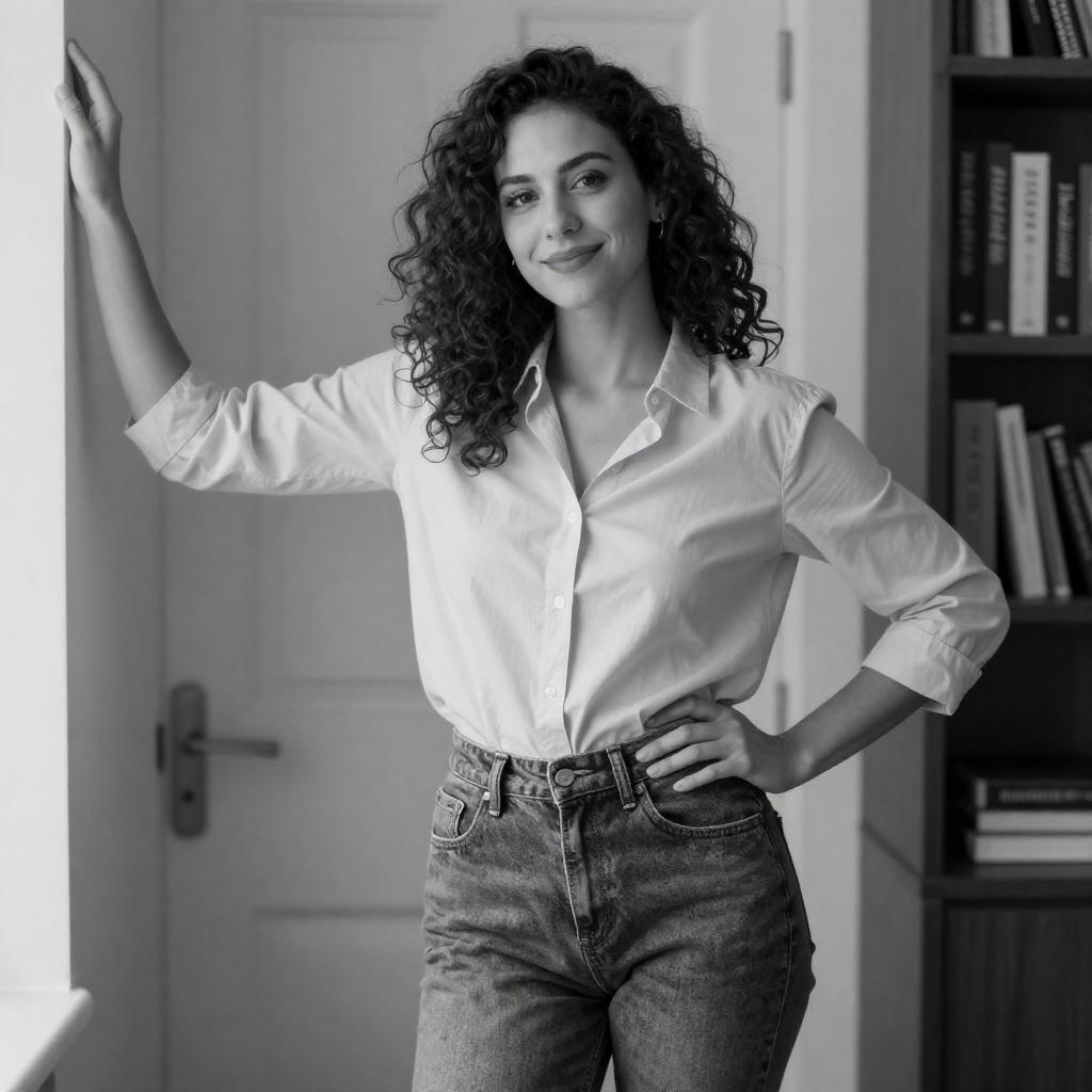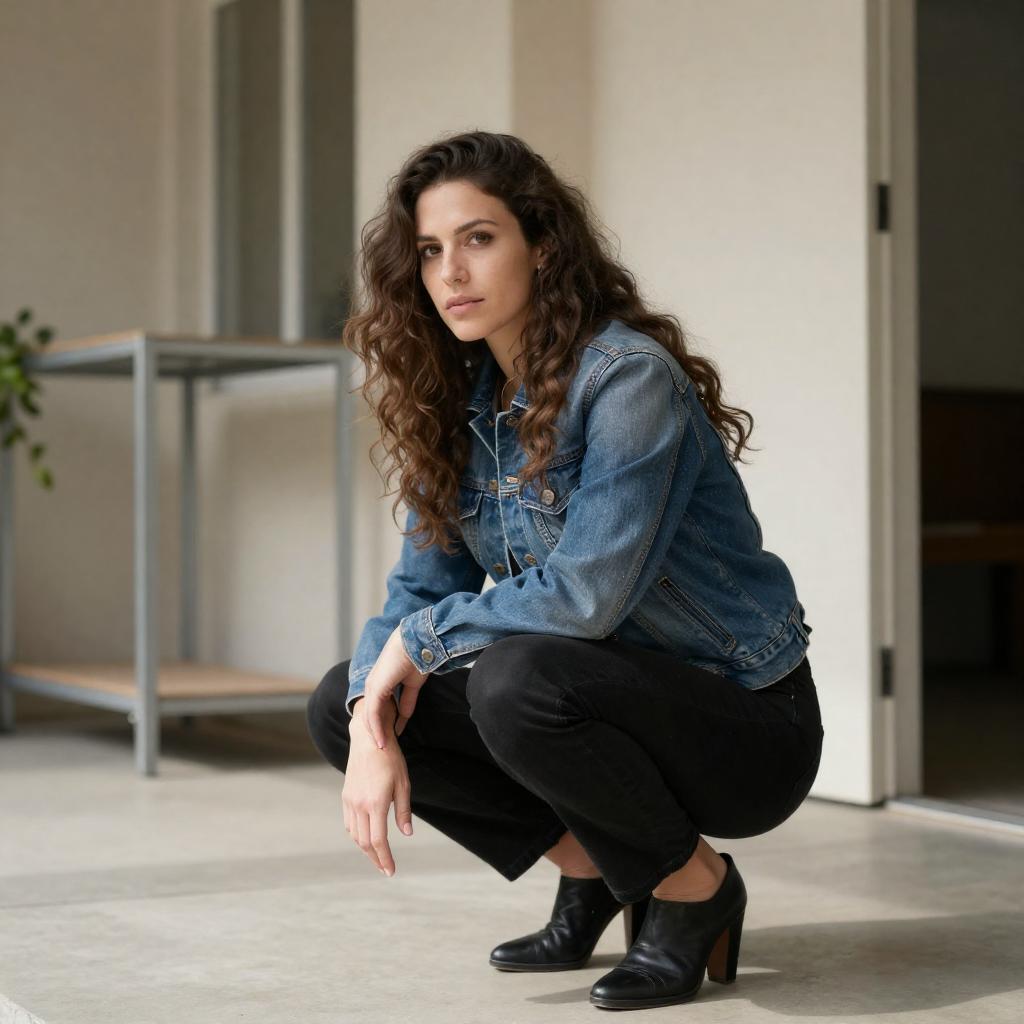 Photograph of a woman with long, wavy brown hair crouching in front of a beige building. She wears a blue denim jacket, black pants, and black shoes. Her right hand touches the ground while her left hand rests on her knee. Background includes metal shelves and green plants. Her face is partially visible, showing a focused expression. The building has a large, partially open door on the right. Sunlight casts shadows on the concrete floor.