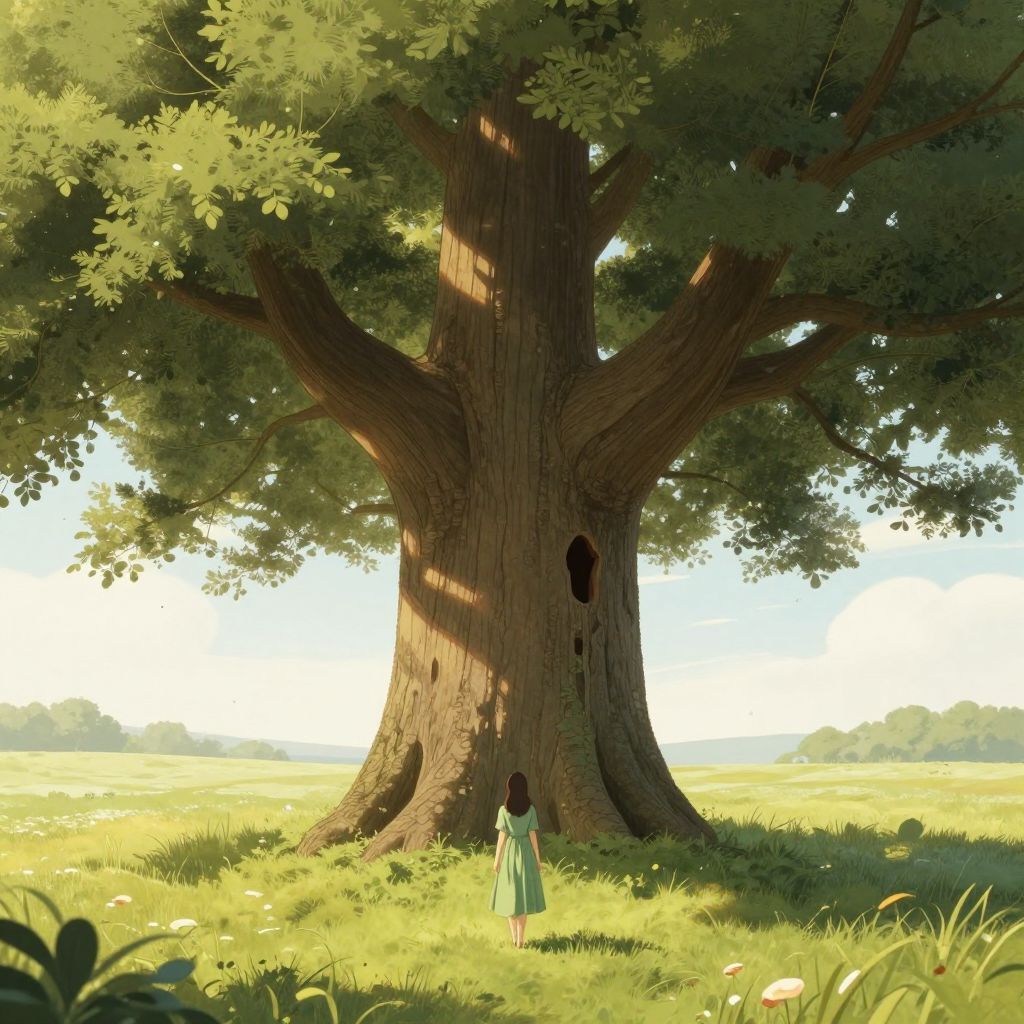 Digital illustration of a young girl in a green dress standing beneath a large, ancient tree with a thick trunk and sprawling branches. The tree's bark is textured, and there's a dark hollow in the trunk. The girl is seen from behind, gazing up at the tree. The background is a sunlit, lush green meadow with bright yellow wildflowers scattered across the grass. The sky is clear blue with soft sunlight filtering through the tree's leaves, casting dappled shadows on the ground. The overall style is whimsical and serene, evoking a sense of wonder and calm.