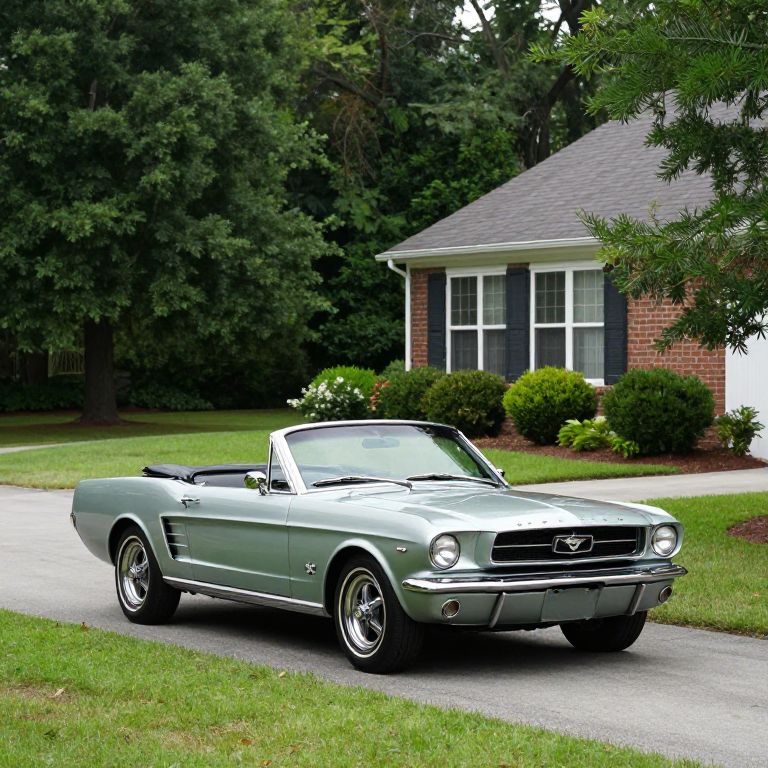 Classic 1966 Ford Mustang convertible parked gracefully in a suburban driveway surrounded by lush greenery and manicured shrubs in Alpharetta, Georgia.