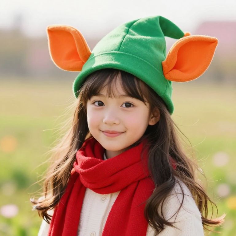 A young girl with long, flowing black hair stands in a sunny meadow, wearing a vibrant red, white, and black dress that flutters gently in the breeze. She has a red and white striped scarf wrapped around her neck, adding a cheerful contrast to her outfit. On her head is a bright red hat adorned with a white pom-pom on top, giving her a playful and festive look. The background features soft green grass, blooming flowers, and a clear blue sky, creating a joyful and whimsical atmosphere.