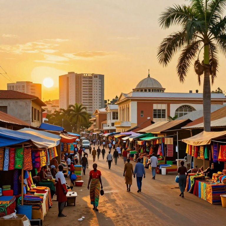 Accra cityscape at sunset, vibrant streets filled with colorful market stalls, traditional Ghanaian fabrics, bustling crowds, modern and colonial architecture blend, warm golden light casting long shadows, tropical palm trees swaying gently, artistic digital painting style