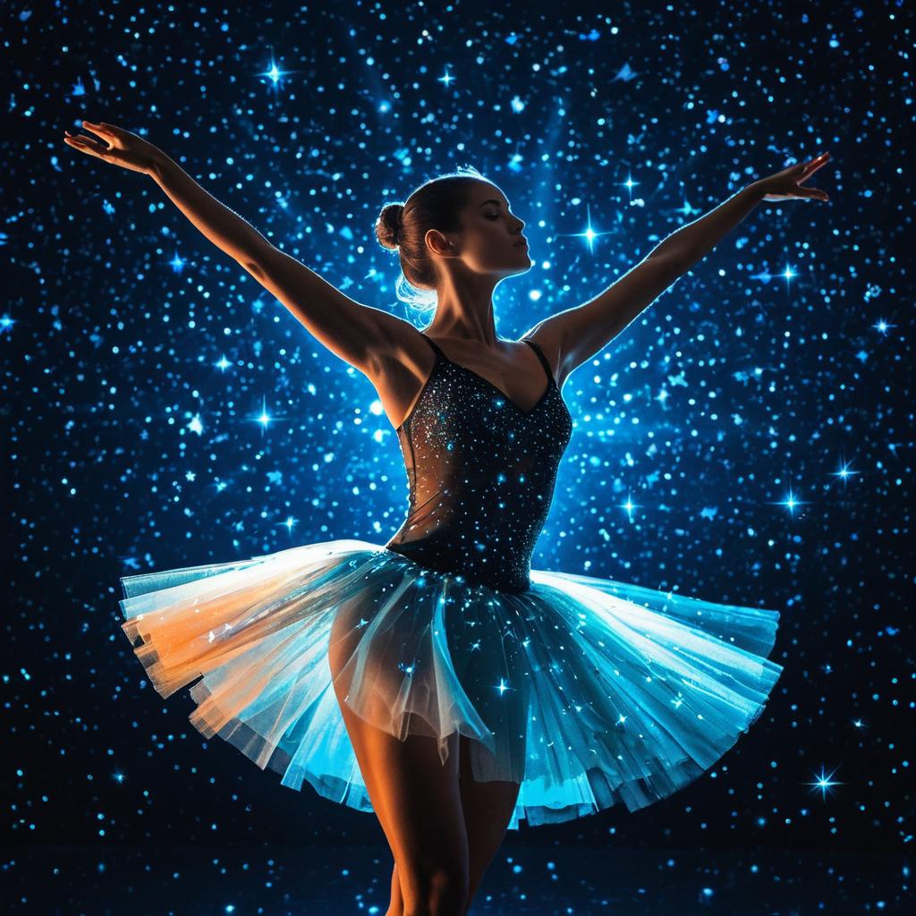 Glassy silhouette ballerina made out of glass, striking a ballerina pose with her arms up, wearing a transparent feuilles tutu, see-through body, surrounded by a bright blue glow, dark background covered with glowing stars, there is a galaxy in the background at the top corners of the screen, falling stars colored in a bright orange hue, dynamic pose