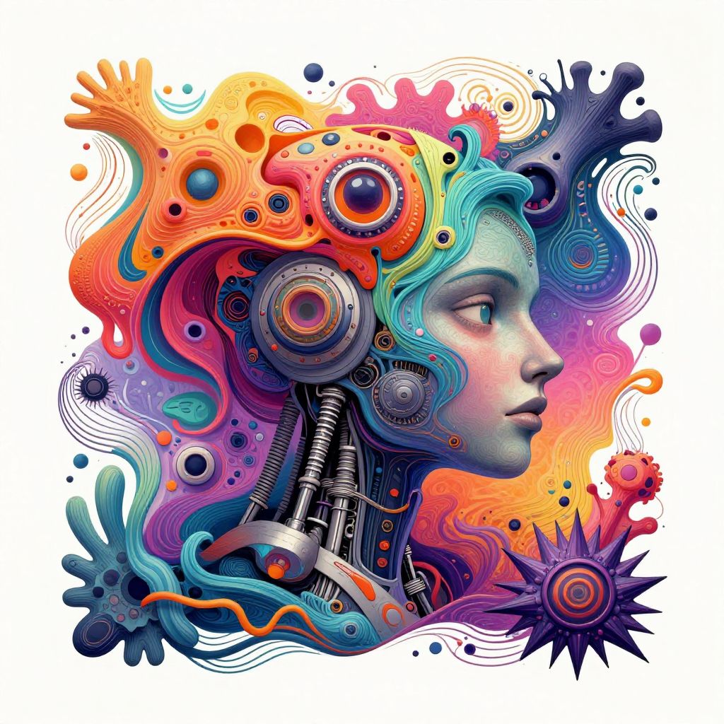 AI cover art generator free producing a surreal, colorful cover featuring a blend of organic and mechanical elements, with flowing lines, bright gradients, and intricate texture details, evoking innovation and artistic freedom.